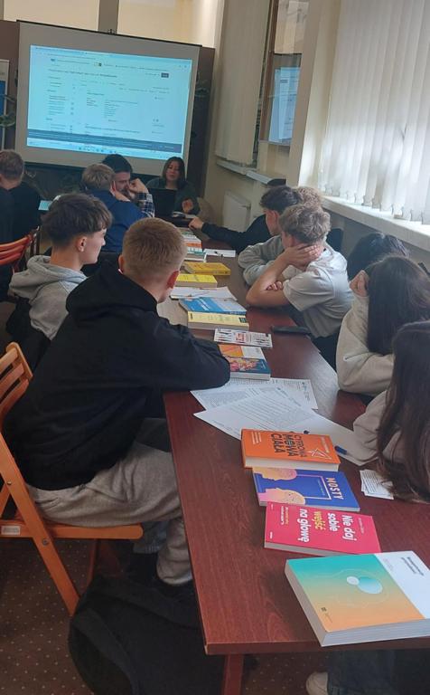 Panie z biblioteki zapoznały uczniów z historią i ofertą Biblioteki Pedagogicznej w Mielcu. Przygotowały bibliografię z tematyki doradztwa zawodowego oraz budowania relacji pod hasłem „Siła relacji w erze samotności”. Ponadto dowiedzieli się jak korzystać z katalogu Integro, a następnie sami z przygotowanych materiałów mogli praktycznie sprawdzić swoje umiejętności wyszukując w katalogu hasła, książki o tematyce o poradnictwie zawodowym, emocjach, budowaniu relacji oraz o komunikacji czy stawianiu granic.