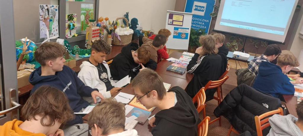 Panie z biblioteki zapoznały uczniów z historią i ofertą Biblioteki Pedagogicznej w Mielcu. Przygotowały bibliografię z tematyki doradztwa zawodowego oraz budowania relacji pod hasłem „Siła relacji w erze samotności”. Ponadto dowiedzieli się jak korzystać z katalogu Integro, a następnie sami z przygotowanych materiałów mogli praktycznie sprawdzić swoje umiejętności wyszukując w katalogu hasła, książki o tematyce o poradnictwie zawodowym, emocjach, budowaniu relacji oraz o komunikacji czy stawianiu granic.